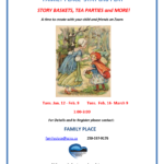 STORY BASKETS, TEA PARTIES and MORE! A time to create with your child and friends on Zoom Tues. Jan. 12 – Feb. 9 Tues. Feb. 16- March 9 1:00-3:00 For Details and to Register please contact: FAMILY PLACE familyplace@ssics.ca 250-537-9176