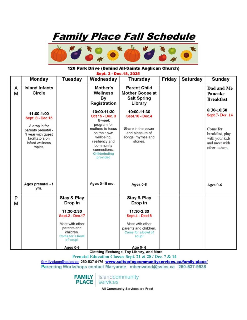 Family Place is a resource and drop-in program centrally located in Ganges Salt Spring Island, offering a safe and well equipped indoor and outdoor play area, a variety of drop-in and scheduled programs and courses and a range of resources for parents and caregivers of children under six.