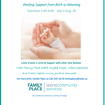 Mondays 10:00am-12:00pm For Parents and Babies in the First Year Come create a circle of support with other families! Sept. 9 – Welcome & Community Resources – Hannah Kahane, Family Place Program Coordinator Sept.16 – Breastfeeding Support – Angela Flegel, Breastfeeding Support Facilitator, Childbirth Educator Sept. 23 – Sleep Practices for Baby and You – […]