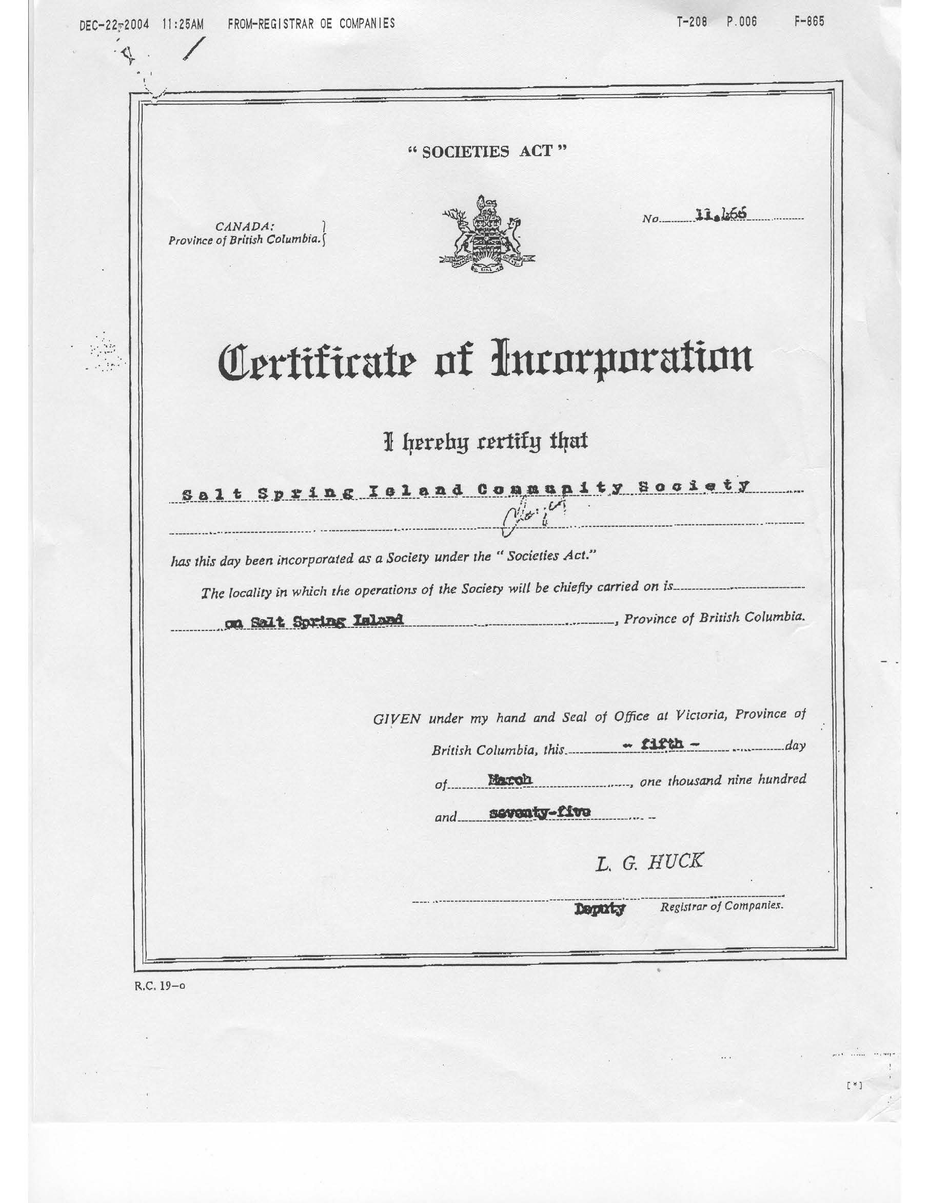 The Salt Spring Island Community Society is incorporated under the BC Societies Act.